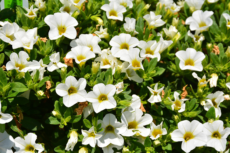 Aloha Nani White Calibrachoa is blanketed in stunning white trumpet-shaped flowers with gold throats at the ends of the stems from late spring to early fall. Its small pointy leaves remain green in colour throughout the season.