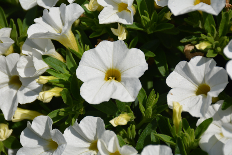 Calipetite® White Calibrachoa will grow to be about 10 inches tall at maturity, with a spread of 12 inches. When grown in masses or used as a bedding plant, individual plants should be spaced approximately 8 inches apart. Its foliage tends to remain low and dense right to the ground. This fast-growing annual will normally live for one full growing season, needing replacement the following year.
