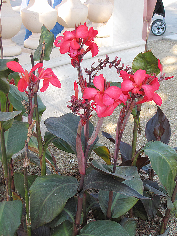 A tropical look in the garden with huge burgundy variegated leaves; large flowers that are rich rose-coral, on top of this shorter variety; perfect for borders or as an accent; perennial only where roots don't freeze