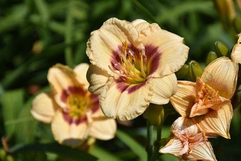 A compact selection that features small, lightly ruffled, creamy-pink flowers with cherry red eyezones and lime green throats; strong, sturdy stems rise above arching green foliage; easy to grow, great addition to borders, beds and containers