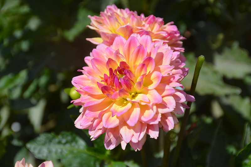 This stunning dahlia is a showy bloomer, producing masses of large rose and yellow flowers with deep pink reverses; wonderful along borders or in containers