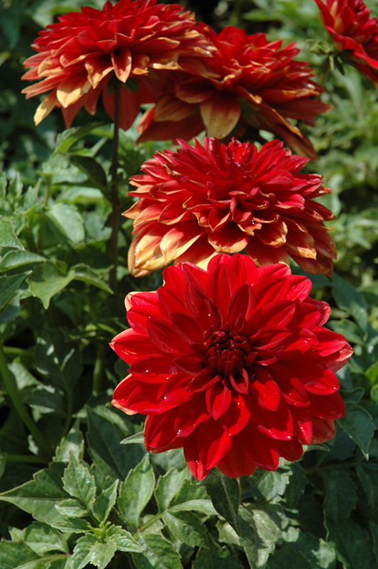 This stunning dahlia is a showy bloomer, producing masses of large deep red flowers with yellow centers in mid-summer; wonderful along borders or in containers