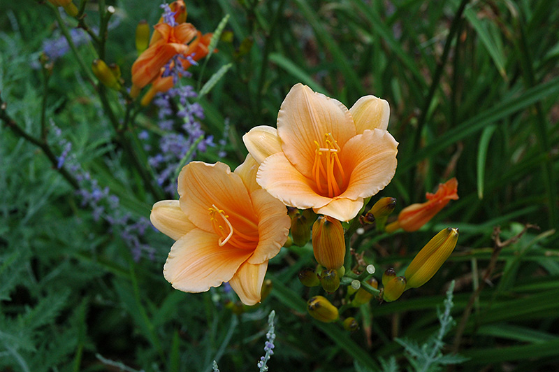 Dainty, miniature cantaloupe-peach colored, lightly ruffled flowers with orange throats; strong stems rise above low growing mounds of slender, arching foliage; adds a beautiful softness to borders, beds and containers; early midseason blooming