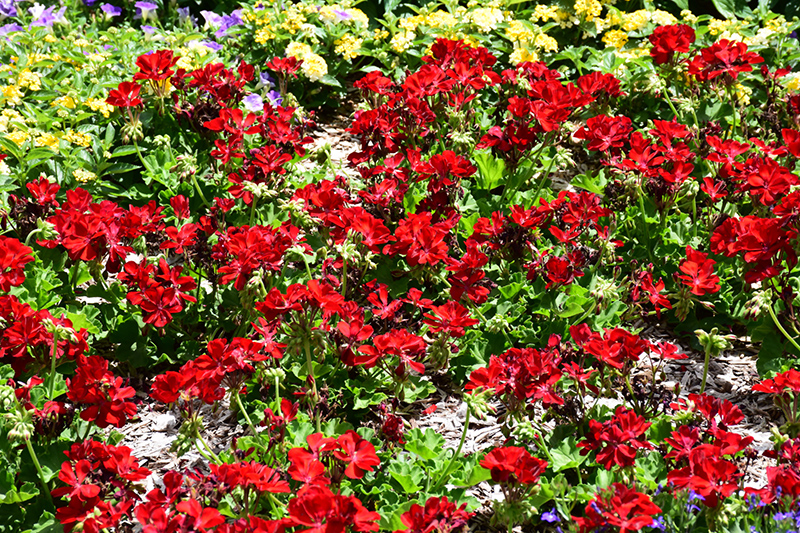 Calliope® Medium Dark Red Geranium will grow to be about 18 inches tall at maturity, with a spread of 15 inches. When grown in masses or used as a bedding plant, individual plants should be spaced approximately 12 inches apart. Its foliage tends to remain dense right to the ground, not requiring facer plants in front. Although it's not a true annual, this fast-growing plant can be expected to behave as an annual in our climate if left outdoors over the winter, usually needing replacement the following year. As such, gardeners should take into consideration that it will perform differently than it would in its native habitat.