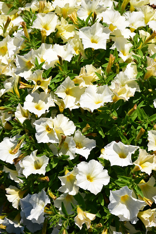 SuperCal® Buttercream Petchoa is covered in stunning creamy white trumpet-shaped flowers with buttery yellow overtones and gold throats at the ends of the stems from mid spring to late summer. Its pointy leaves remain green in colour throughout the season.