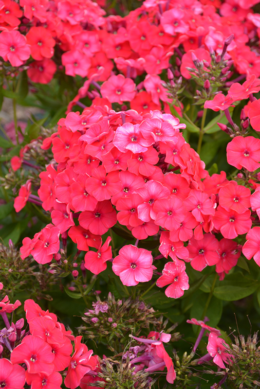 Peacock™ Cherry Red Garden Phlox will grow to be about 18 inches tall at maturity extending to 24 inches tall with the flowers, with a spread of 12 inches. When grown in masses or used as a bedding plant, individual plants should be spaced approximately 15 inches apart. It tends to be leggy, with a typical clearance of 1 foot from the ground, and should be underplanted with lower-growing perennials. It grows at a medium rate, and under ideal conditions can be expected to live for approximately 10 years. As an herbaceous perennial, this plant will usually die back to the crown each winter, and will regrow from the base each spring. Be careful not to disturb the crown in late winter when it may not be readily seen!