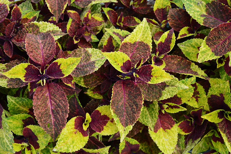 Premium Sun Pineapple Surprise Coleus' attractive serrated pointy leaves remain yellow in colour with showy burgundy variegation and tinges of lime green throughout the year on a plant with an upright spreading habit of growth.
