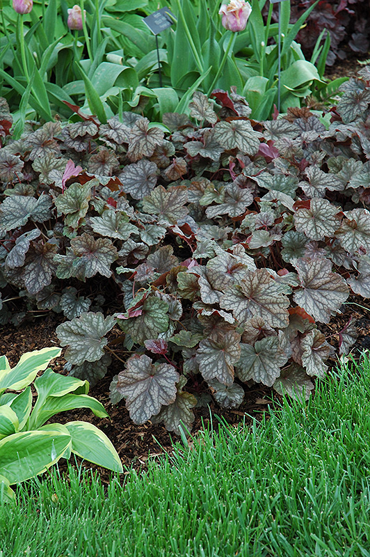 Pewter Veil Coral Bells will grow to be about 10 inches tall at maturity extending to 24 inches tall with the flowers, with a spread of 12 inches. When grown in masses or used as a bedding plant, individual plants should be spaced approximately 10 inches apart. Its foliage tends to remain low and dense right to the ground. It grows at a medium rate, and under ideal conditions can be expected to live for approximately 10 years. As an evegreen perennial, this plant will typically keep its form and foliage year-round.