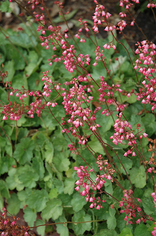 Pretty Polly Coral Bells will grow to be only 6 inches tall at maturity extending to 12 inches tall with the flowers, with a spread of 12 inches. When grown in masses or used as a bedding plant, individual plants should be spaced approximately 10 inches apart. Its foliage tends to remain low and dense right to the ground. It grows at a medium rate, and under ideal conditions can be expected to live for approximately 10 years. As an evegreen perennial, this plant will typically keep its form and foliage year-round.