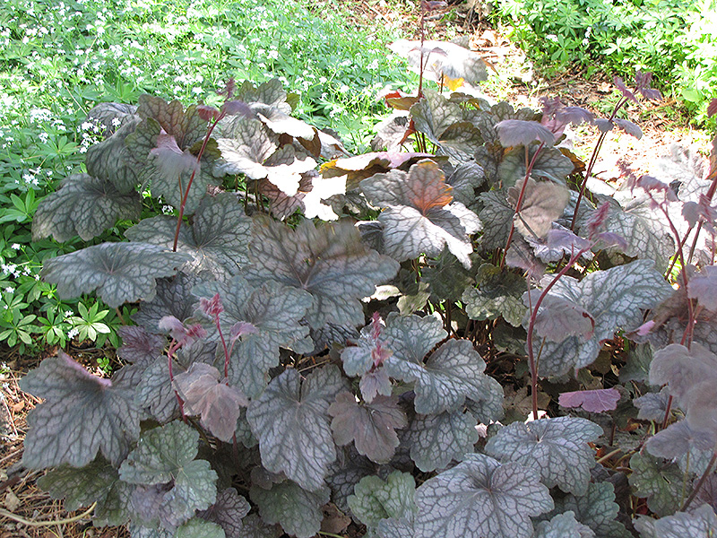 Velvet Night Coral Bells will grow to be about 8 inches tall at maturity extending to 18 inches tall with the flowers, with a spread of 12 inches. When grown in masses or used as a bedding plant, individual plants should be spaced approximately 10 inches apart. Its foliage tends to remain low and dense right to the ground. It grows at a medium rate, and under ideal conditions can be expected to live for approximately 10 years. As an evegreen perennial, this plant will typically keep its form and foliage year-round.