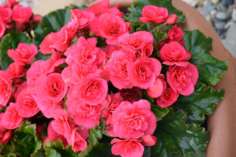 Evi Bright Pink Begonia features dainty semi-double hot pink frilly flowers with scarlet overtones at the ends of the stems from mid spring to mid fall. Its succulent heart-shaped leaves remain dark green in colour throughout the year.