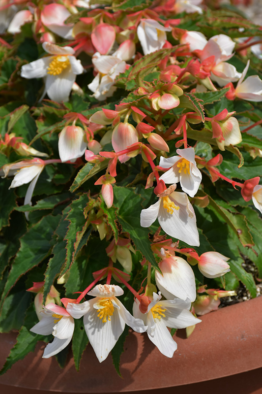 RiseUp™ Sansibel Peach Begonia features showy double peach orchid-like flowers with yellow throats at the ends of the stems from mid spring to mid fall. Its attractive small glossy pointy leaves remain dark green in colour with distinctive light green veins throughout the year. The dark red stems can be quite attractive.