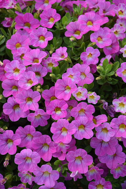 Chameleon™ Pink Passion Calibrachoa is covered in stunning hot pink trumpet-shaped flowers with shell pink overtones and yellow throats at the ends of the stems from late spring to early fall. Its small pointy leaves remain green in colour throughout the season.
