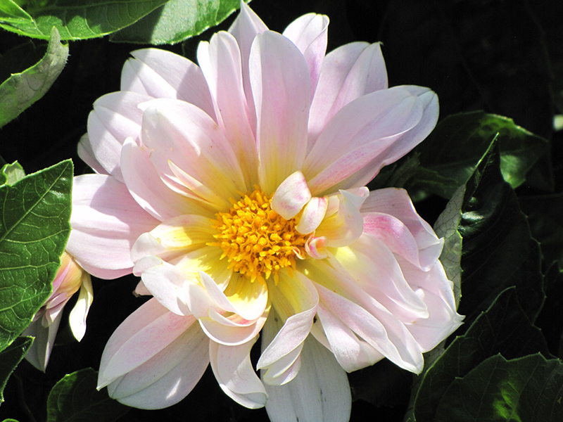 Figaro™ Pink Shades Dahlia features showy semi-double shell pink round flowers with white overtones, gold eyes and yellow centers at the ends of the stems from mid summer to mid fall. The flowers are excellent for cutting. Its pointy leaves remain green in colour throughout the season.