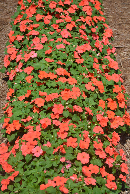 Accent™ Premium Salmon Impatiens will grow to be about 12 inches tall at maturity, with a spread of 12 inches. When grown in masses or used as a bedding plant, individual plants should be spaced approximately 10 inches apart. Its foliage tends to remain dense right to the ground, not requiring facer plants in front. This fast-growing annual will normally live for one full growing season, needing replacement the following year.