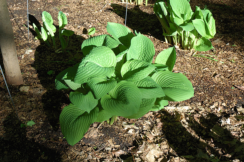 A wonderful medium sized variety featuring dense mounds of heavily textured, green heart-shaped foliage; great for adding contrast and texture to shaded beds and borders; pale lavender flowers rise above on tall scapes during the mid summer months