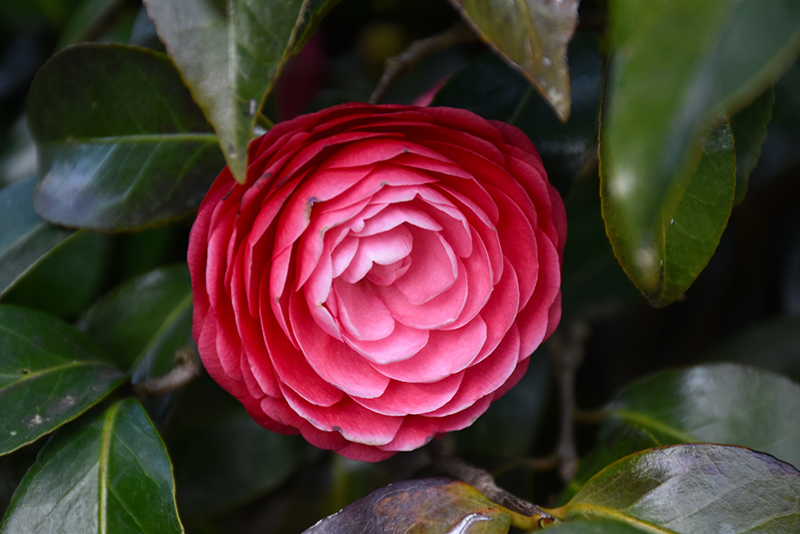 Jacks Camellia features showy fully double crimson round flowers with pink overtones at the ends of the branches from late winter to early spring. It has dark green evergreen foliage. The glossy pointy leaves remain dark green throughout the winter.