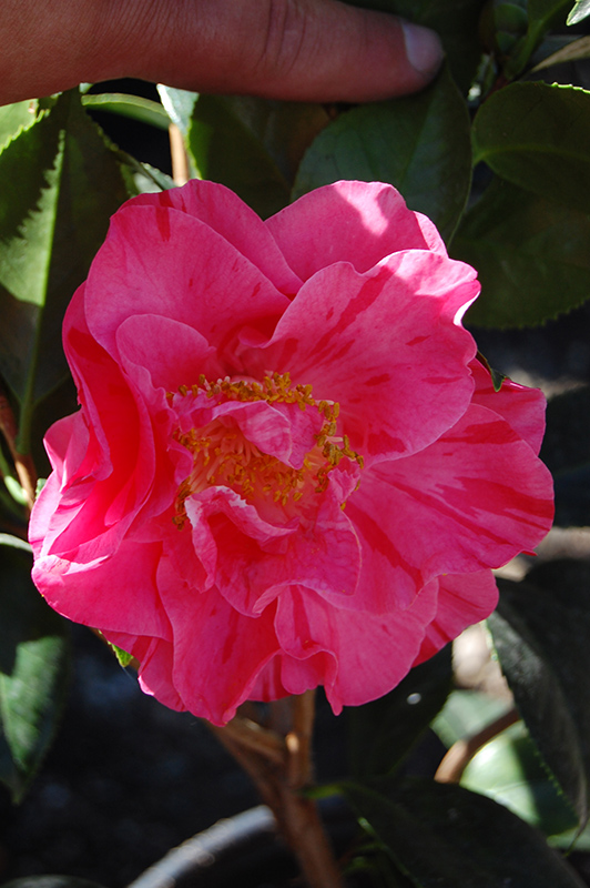 Lady Laura Camellia features showy double pink round flowers with gold eyes and rose streaks at the ends of the branches from late winter to early spring. It has dark green evergreen foliage. The glossy pointy leaves remain dark green throughout the winter.