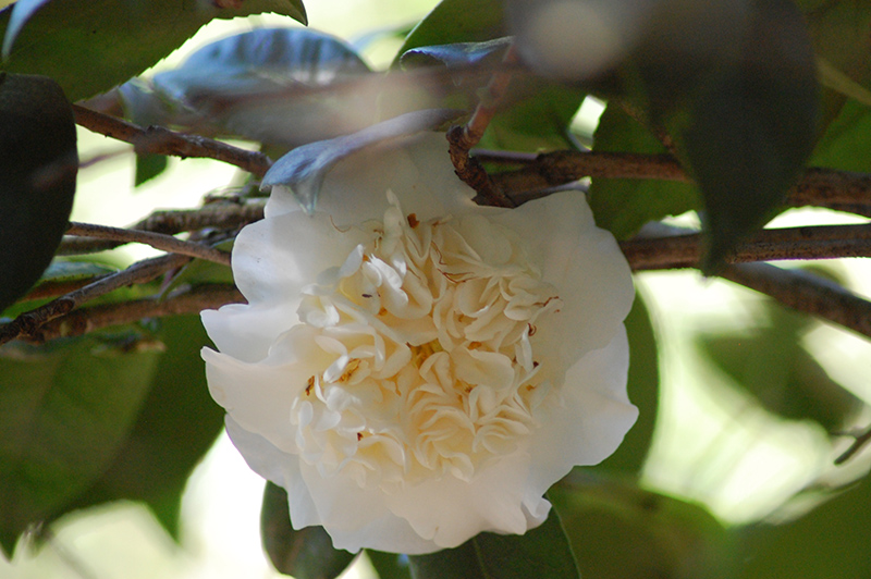 Snow Chan Camellia features showy double white round flowers with buttery yellow eyes at the ends of the branches from late winter to early spring. It has dark green evergreen foliage. The glossy pointy leaves remain dark green throughout the winter.