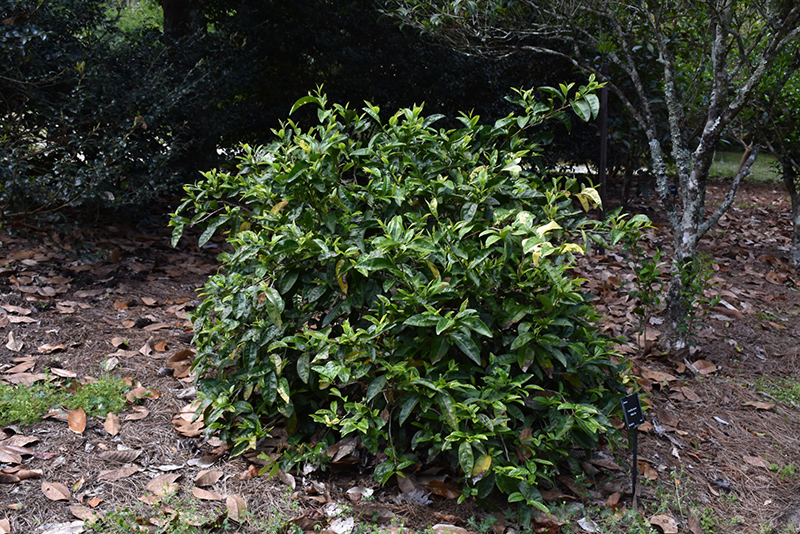 An evergreen shrub or small tree, that is primarily grown for its stunning variegated foliage; large, deep green glossy leaves are splashed with pale yellow; provide rich, acidic, moist, well-drained soil
