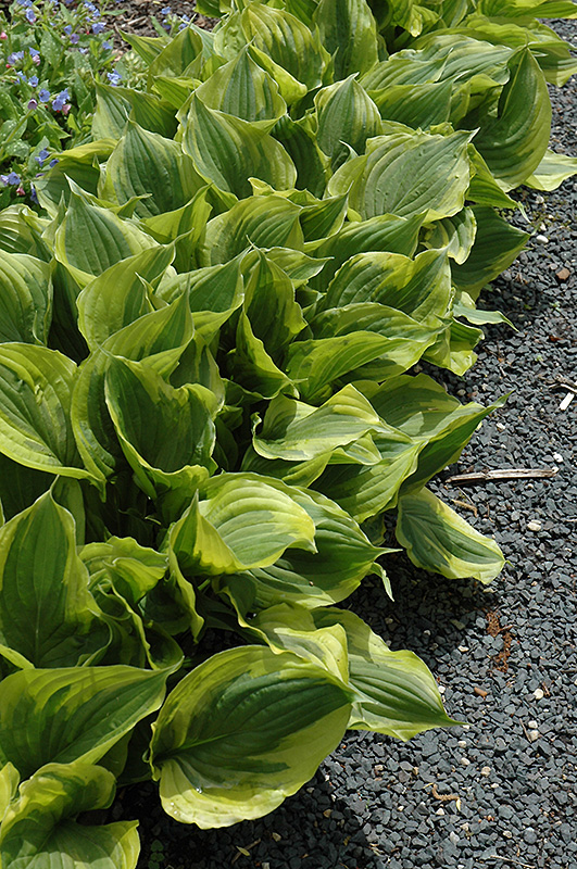 Gold Edger Hosta will grow to be about 8 inches tall at maturity extending to 12 inches tall with the flowers, with a spread of 18 inches. When grown in masses or used as a bedding plant, individual plants should be spaced approximately 15 inches apart. Its foliage tends to remain low and dense right to the ground. It grows at a slow rate, and under ideal conditions can be expected to live for approximately 10 years. As an herbaceous perennial, this plant will usually die back to the crown each winter, and will regrow from the base each spring. Be careful not to disturb the crown in late winter when it may not be readily seen!
