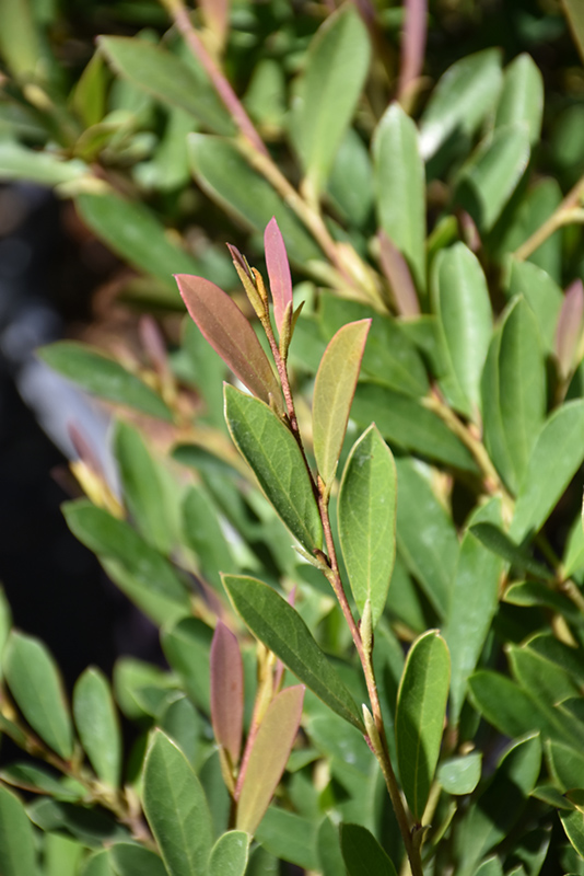 An attractive evergreen plant with emerging plum-purple new foliage that matures to a matte finish blue-green; in late winter to early spring, red flowers emerge along the older branches; very elegant when massed together or as an accent shrub