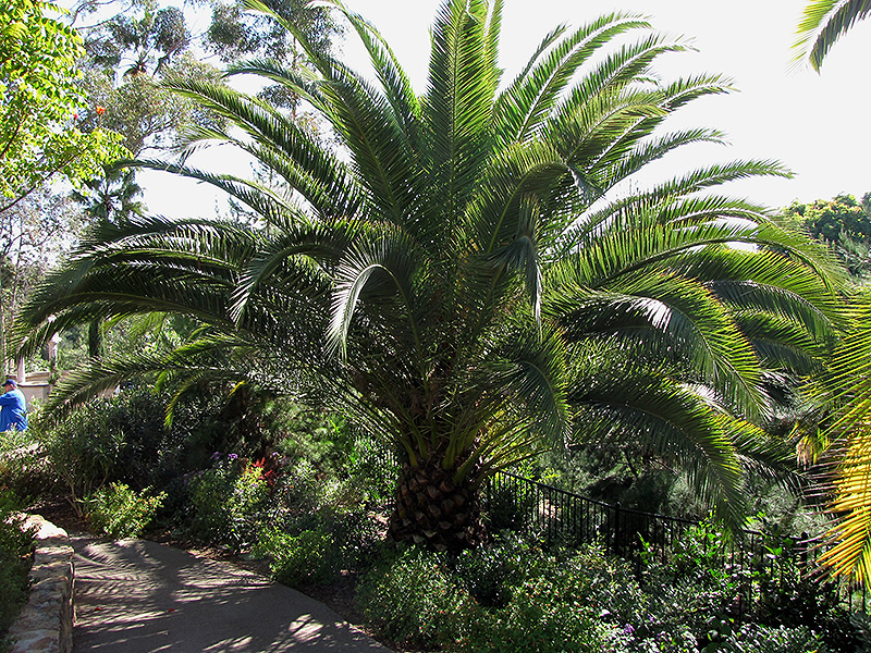 Robust Sylvester Date Palm will grow to be about 40 feet tall at maturity, with a spread of 20 feet. It has a high canopy of foliage that sits well above the ground, and should not be planted underneath power lines. As it matures, the lower branches of this tree can be strategically removed to create a high enough canopy to support unobstructed human traffic underneath. It grows at a slow rate, and under ideal conditions can be expected to live for 60 years or more. This is a dioecious species, meaning that individual plants are either male or female. Only the females will produce fruit, and a male variety of the same species is required nearby as a pollinator.