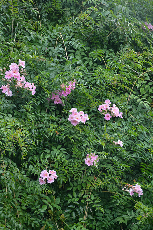 Pink Trumpet Vine features showy clusters of fragrant pink trumpet-shaped flowers with hot pink veins at the ends of the branches from mid to late summer. Its glossy pointy compound leaves remain green in colour throughout the year.