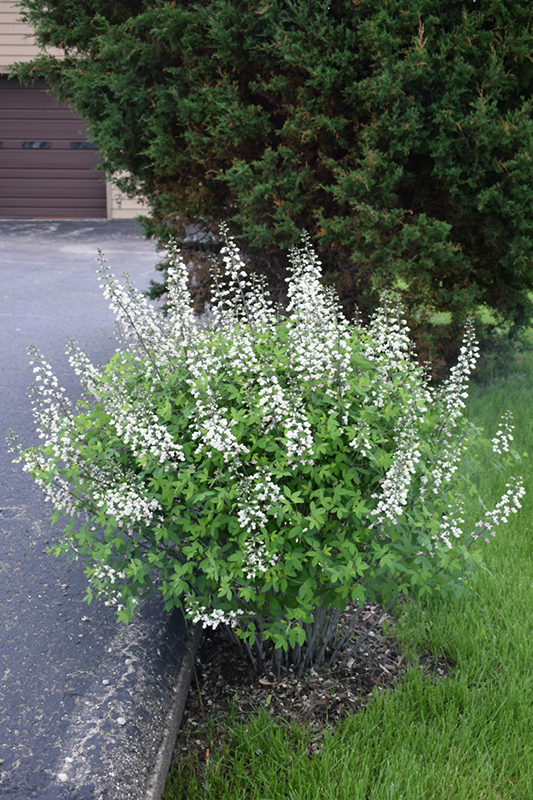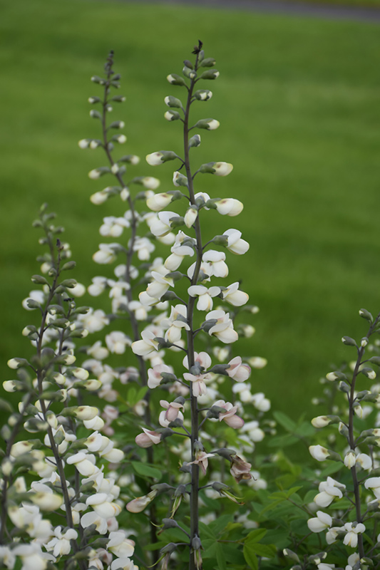 Ivory Towers False Indigo will grow to be about 4 feet tall at maturity, with a spread of 4 feet. It tends to be leggy, with a typical clearance of 1 foot from the ground, and should be underplanted with lower-growing perennials. It grows at a slow rate, and under ideal conditions can be expected to live for approximately 25 years. As an herbaceous perennial, this plant will usually die back to the crown each winter, and will regrow from the base each spring. Be careful not to disturb the crown in late winter when it may not be readily seen!