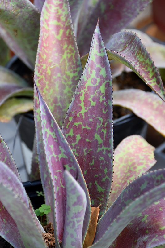 This attractive selection produces a rosette of thick, deep burgundy red succulent leaves with mottled green variegation and toothed margins; grown primarily for foliage; a great low-maintenance patio plant; must have good drainage
