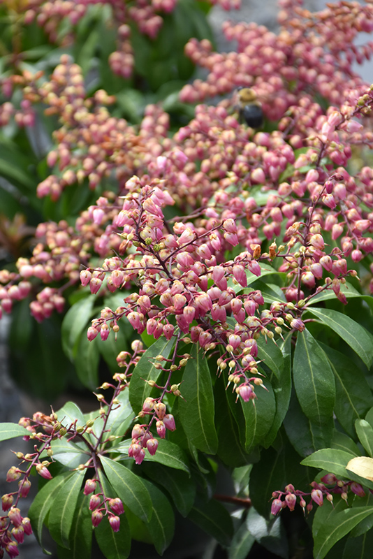 A highly ornamental broadleaf evergreen shrub, prized for its delicate and showy chains of bright pink bell-shaped flowers, and brick red emerging foliage on dark red stems; a dense and compact variety; performs best in moist, organic and acidic soils