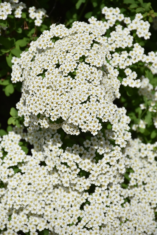 Wedding Cake® Spirea is smothered in stunning clusters of white flowers with chartreuse eyes held atop the branches from late spring to early summer. It has bluish-green deciduous foliage. The small serrated oval leaves turn an outstanding coppery-bronze in the fall.