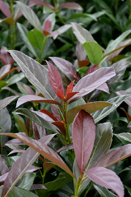 A wonderful upright spreading shrub with showy dark maroon to copper new growth that re-appears after each pruning; creamy white pinwheel-like flowers in early spring followed by red fruit; has season-long appeal; makes a great specimen or screen