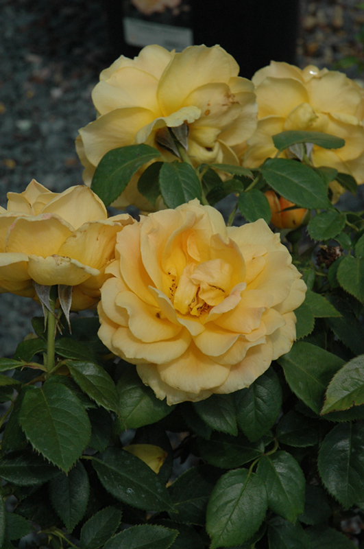 Easy Going™ Rose (tree form) features showy lightly-scented double gold flowers with yellow overtones and peach streaks at the ends of the branches from late spring to early fall. The flowers are excellent for cutting. It has green deciduous foliage. The glossy oval compound leaves do not develop any appreciable fall colour.