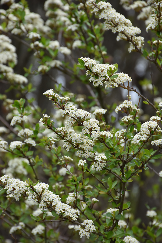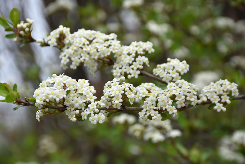 A wonderful compact cultivar selected for extremely heavy bloom, with showy clusters of snowy white lacecap flowers in early spring, followed by red fruit in summer that matures to black; adaptable, makes a great specimen or screen