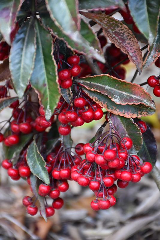 Red Hot Embers™ Coral Berry features dainty clusters of pink bell-shaped flowers with white edges at the ends of the branches in mid spring. It has attractive burgundy-variegated dark green foliage with hints of plum purple which emerges hot pink in spring. The glossy pointy leaves are highly ornamental and remain dark green throughout the winter. It features an abundance of magnificent red berries from mid fall to early spring.