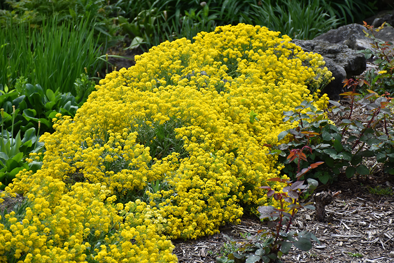 Gold Dust Basket Of Gold will grow to be about 12 inches tall at maturity, with a spread of 24 inches. Its foliage tends to remain dense right to the ground, not requiring facer plants in front. It grows at a medium rate, and under ideal conditions can be expected to live for approximately 10 years. As an herbaceous perennial, this plant will usually die back to the crown each winter, and will regrow from the base each spring. Be careful not to disturb the crown in late winter when it may not be readily seen!