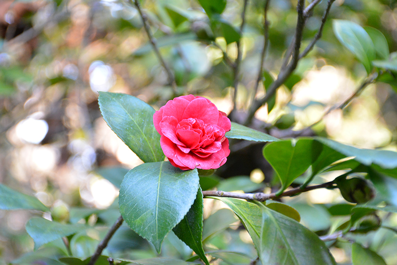 Little Slam Camellia features showy double red round flowers at the ends of the branches from late winter to early spring. It has dark green evergreen foliage. The glossy pointy leaves remain dark green throughout the winter.