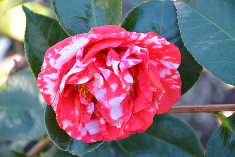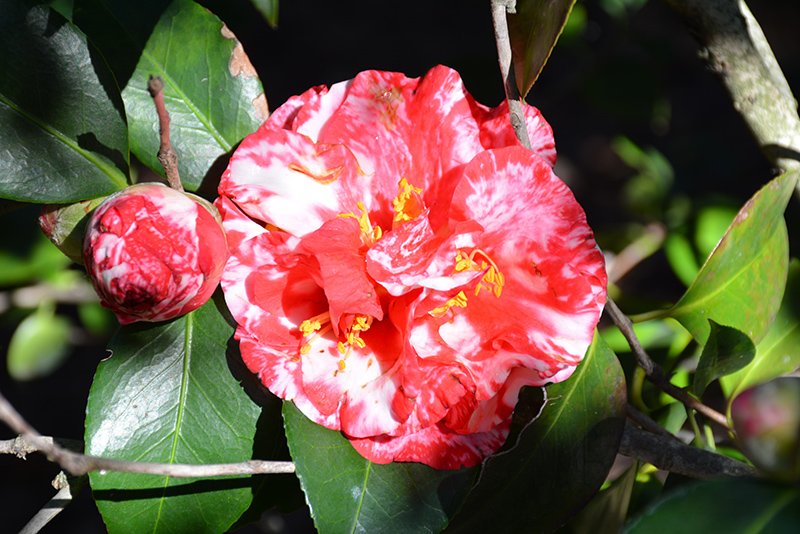 Stunning crimson and white variegated flowers cover this upright shrub in late winter to early spring; blooms are double to peony in form; lustrous, oval, evergreen leaves persist all year; provide rich, acidic, moist, well-drained soil