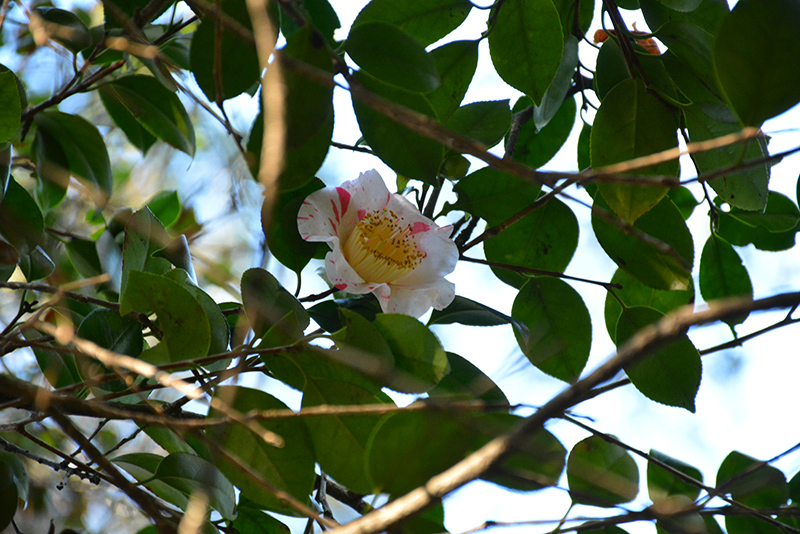 Nioi-fubuki Camellia features showy fragrant white round flowers with buttery yellow eyes and red stripes at the ends of the branches from late winter to early spring. It has dark green evergreen foliage. The glossy oval leaves remain dark green throughout the winter.
