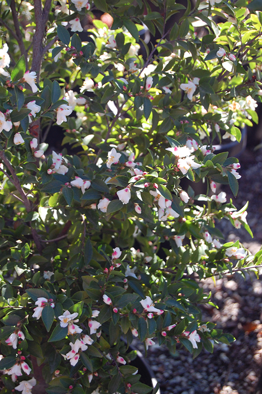 This well branched shrub is covered with clusters of small, single flowers from winter to mid spring; fragrant white blooms emerge from vivid red buds; has attractive, lustrous, evergreen foliage; provide rich, acidic, moist, well-drained soil
