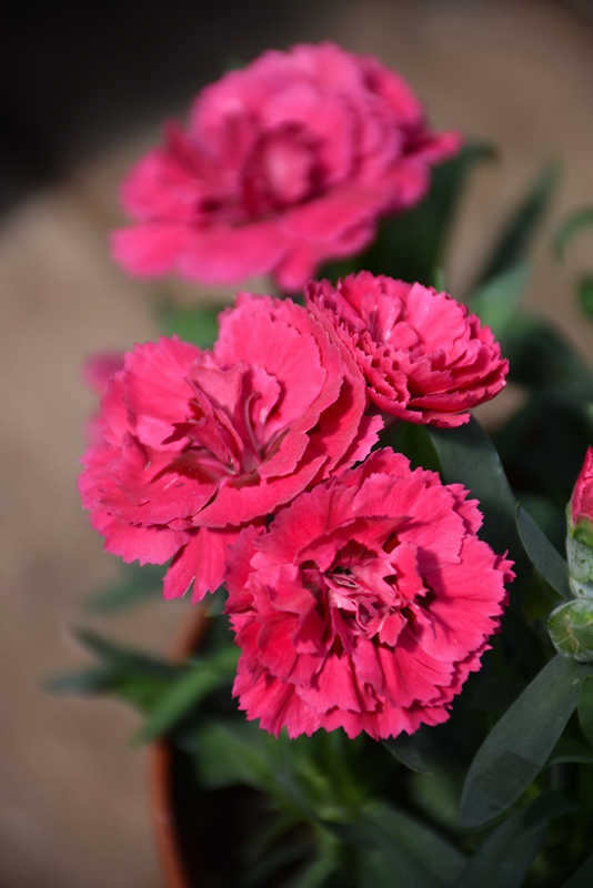 Double cherry red and velvety crimson miniature carnations on short stemmed, compact plants; blooms consistently over a long season, especially in warmer climates; great for border fronts, containers, and floral arrangements