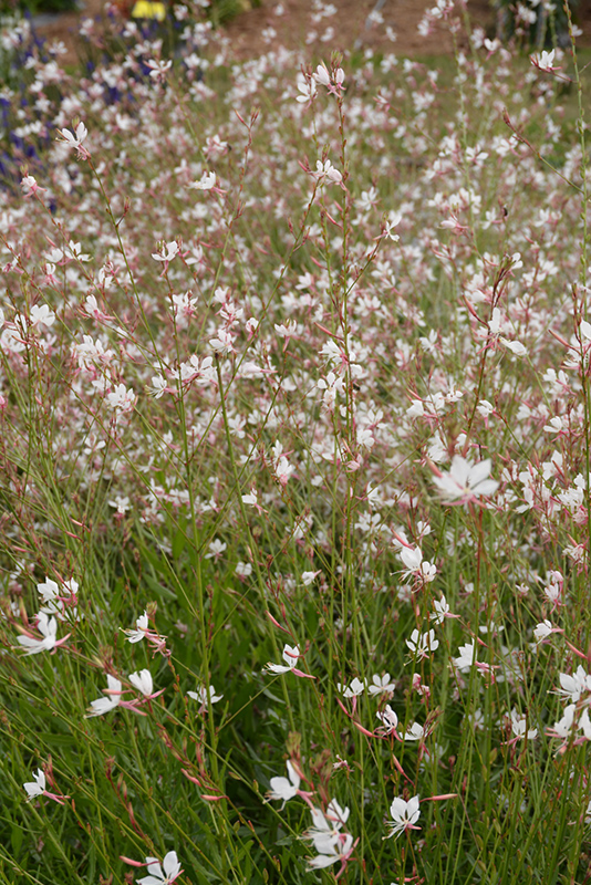 Summer Breeze Gaura will grow to be about 3 feet tall at maturity extending to 4 feet tall with the flowers, with a spread of 3 feet. When grown in masses or used as a bedding plant, individual plants should be spaced approximately 24 inches apart. Its foliage tends to remain dense right to the ground, not requiring facer plants in front. Although it's not a true annual, this fast-growing plant can be expected to behave as an annual in our climate if left outdoors over the winter, usually needing replacement the following year. As such, gardeners should take into consideration that it will perform differently than it would in its native habitat.