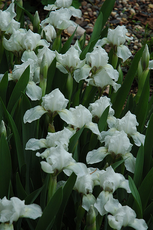 White Light Iris will grow to be about 10 inches tall at maturity extending to 16 inches tall with the flowers, with a spread of 12 inches. When grown in masses or used as a bedding plant, individual plants should be spaced approximately 10 inches apart. Its foliage tends to remain low and dense right to the ground. It grows at a medium rate, and under ideal conditions can be expected to live for approximately 10 years. As an herbaceous perennial, this plant will usually die back to the crown each winter, and will regrow from the base each spring. Be careful not to disturb the crown in late winter when it may not be readily seen!