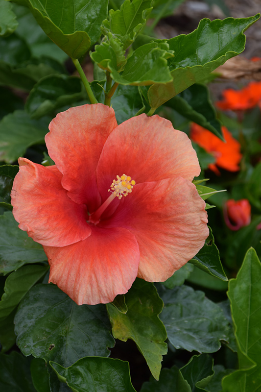 This bold garden perennial features showy ruffled, large apricot pink flowers with red eyes; attractive, glossy, dark-green leaves; ideal for the mixed garden border or in mass; do not allow to dry to wilting point