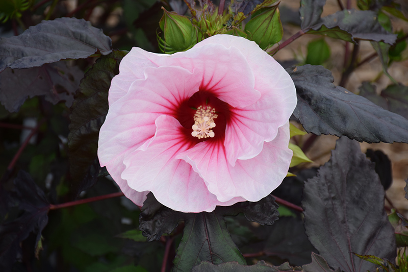 Carousel™ Pink Candy Hibiscus features bold pink round flowers with white overtones, dark red eyes and creamy white anthers at the ends of the stems from mid summer to early fall. Its attractive glossy oval leaves remain burgundy in colour with hints of deep purple throughout the season.
