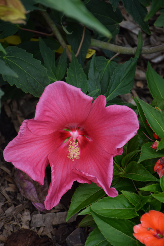 Summer Spice® Crepe Suzette™ Hibiscus features bold rose round flowers with pink overtones and red eyes at the ends of the stems from early summer to early fall. Its large glossy pointy leaves remain dark green in colour throughout the season.