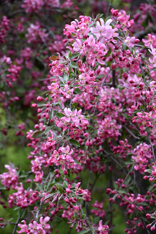 Magnificent deep red buds open to fragrant pink flowers in abundance, along graceful weeping branches; volumes of crimson fruit emerge in late summer and are persistent throughout fall; purple new foliage matures to bronze-green in spring and summer