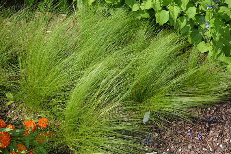 Pony Tails Mexican Feather Grass will grow to be about 20 inches tall at maturity, with a spread of 24 inches. Its foliage tends to remain dense right to the ground, not requiring facer plants in front. It grows at a medium rate, and under ideal conditions can be expected to live for approximately 20 years. As an herbaceous perennial, this plant will usually die back to the crown each winter, and will regrow from the base each spring. Be careful not to disturb the crown in late winter when it may not be readily seen!