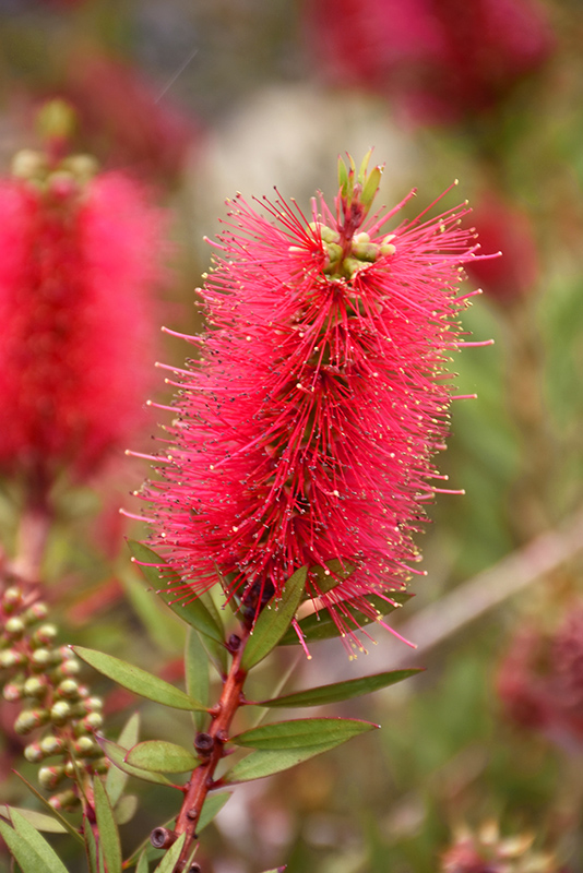 This graceful large shrub or small tree makes a unique addition to the landscape; its narrow, light gray-green foliage, gives it a soft appearance; branches are adorned with striking fuchsia bottlebrush flowers all year, but mostly spring to early summer